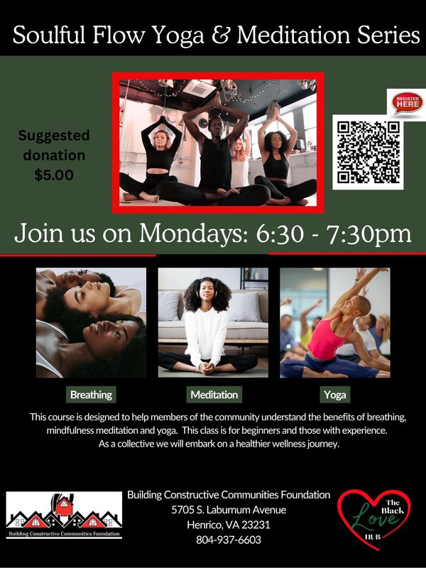 Join us on Monday's from 6:30-7:30pm for mindfulness meditation, breathing and yoga. This is a safe space designed to enhance emotional & spiritual wellness.